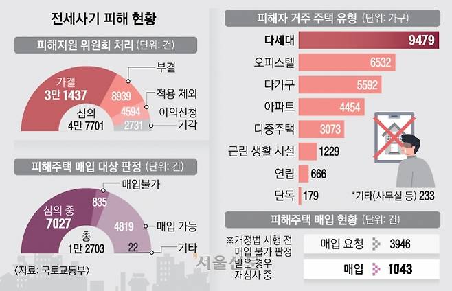 30일 국토교통부에 따르면 전세사기 피해 건수는 총 3만 1437건으로 집계됐다. 한국토지주택공사(LH)가 전세사기 주택을 경매에서 낙찰받은 뒤 차액을 피해자에게 나눠주는 내용의 전세사기 특별법에 따라 LH는 지금까지 1043가구를 매입했다. 전체 피해 건수 가운데 신탁사기 피해는 1339건으로, 이 중 피해자 188가구가 주택 매입을 신청했다. 그러나 LH가 지금까지 매입한 신탁사기 피해 주택은 0건이다.