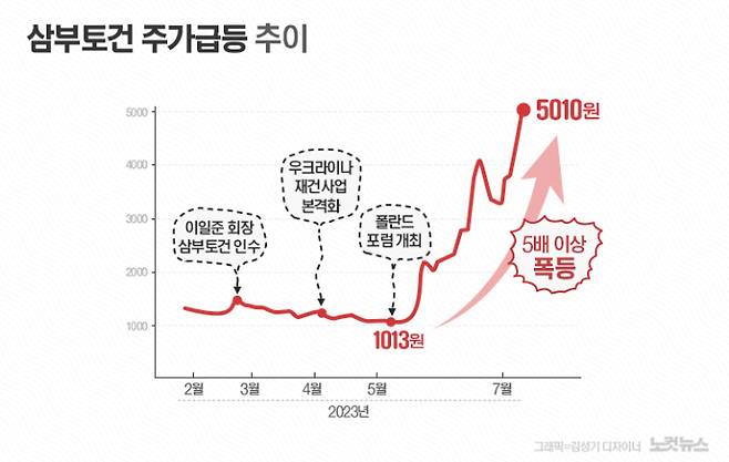 삼부토건은 최대주주가 바뀌고 3개월이 지난 2023년 5월22일 폴란드에서 열린 우크라이나 재건 포럼에 참석했다. '우크라이나 재건 테마주'로 묶인 삼부토건 주가는 주당 1천원대에서 두 달여 만에 5천원대까지 폭등했다. 원희룡 당시 국토부장관은 2023년 8월 새미준 정기 세미나에 강연자로 참석했다.