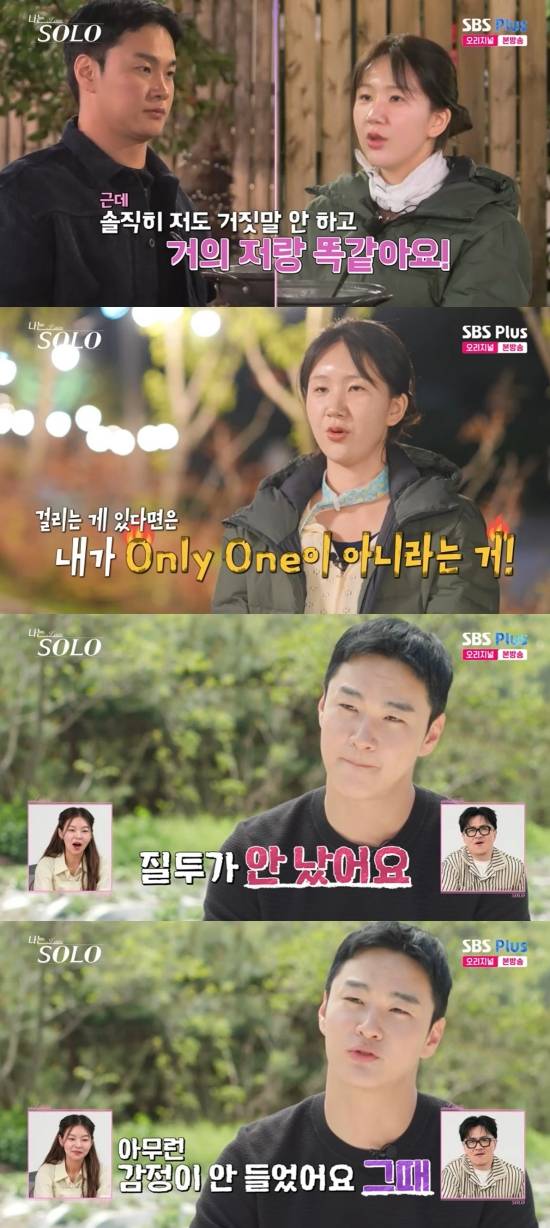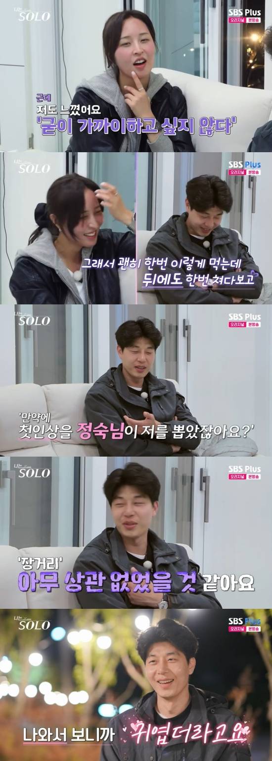 이어 "만약에 첫인상을 정숙님이 저를 뽑았으면 장거리 아무 상관 없었을 것 같다. 장거리? 그까짓꺼 내가 희생하지 뭐. 서로 맞았으니까. 그러니까 모험을 하고 싶지 않았던 거다. 그게 진짜 속마음이었던 것 같다. 그니까 (정숙 님한테 내가) 살짝 삐쳤던 것"이라고 속마음을 표현했다.
