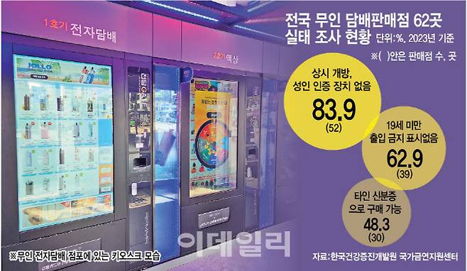 30일 이데일리가 찾은 무인 전자담배 점포 2곳은 모두 학교 코 앞, 100m도 안 되는 거리에 있었다. 이 점포들은 ‘냄새 안난다’ ‘예쁘다’ 등의 광고 문구를 붙여 청소년들을 현혹하고 있었다. 이들 무인 점포에서는 성인인증을 해야 담배를 구매할 수 있는 시스템이 있었지만 이마저도 허술했다. 실제 기자가 한 무인 점포에서 실물 신분증이 아닌 신분증을 출력한 종이로 시도해보니 곧바로 성인 인증에 성공했다. 성인 신분증을 복사해 출력하기만 했는데도 담배를 살 수 있는 것이다.