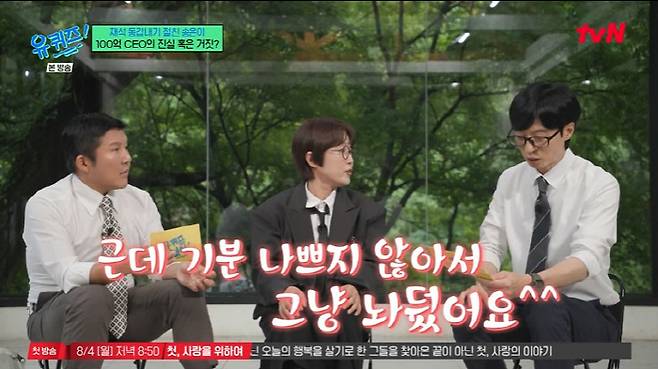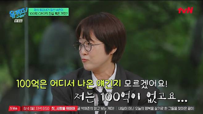 유재석은 송은이를 "상암동에 대형 사옥을 보유한 100억 CEO"라고 소개했으나, 송은이는 "100억은 어디서 나온 얘기인지 모르겠다. 저는 100억이 없다"며 "기분이 나쁘지 않아서 그냥 뒀다"고 웃으며 해명했다.