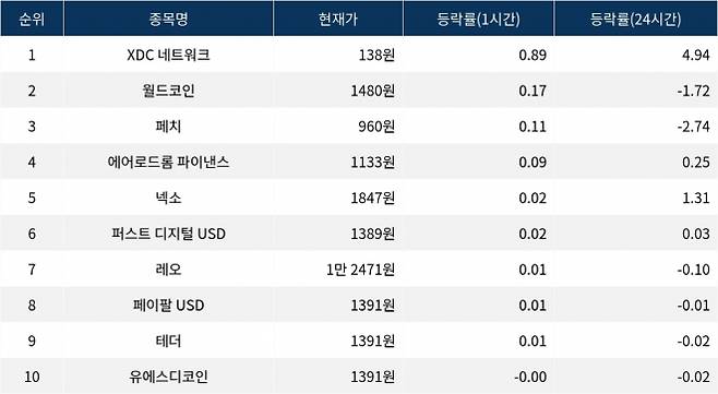[서울데이터랩]XDC 네트워크 월드코인 페치 1시간 상승률 상위
