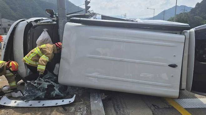 30일 경찰과 소방 당국에 따르면 이날 오후 2시 32분 인제군 북면 한계 사거리에서 A(42) 씨가 몰던 승합차가 신호등 기둥을 들이받고 넘어졌습니다.