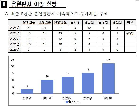 | ▲ 서산소방서에 따르면 온열질환 환자 이송 건수는 지난 2020년 3건이던 것이 지난해는 22건으로, 최근 5년간 매년 온열질환자가 꾸준히 증가하고 있는 것으로 나타났다. |