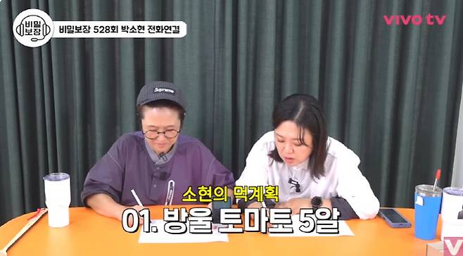 김숙은 "방울토마토 5알 먹었으면 배가 좀 부르다"고 하자, 박소현은 "배가 부르다. 그 다음에 아이스바닐라라떼 마실거다. 우유가 들어가 있기 때문에 배가 엄청 부르다"고 했다.