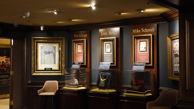 특히 2층 스포츠 바 ‘양스 앤 메츠(Yanks & Mettz)’는 뉴욕 양키스, 뉴욕 메츠, LA 다저스 등 메이저리그 전설들의 소장품을 본격적으로 전시하는 공간이다. 1층과 2층을 잇는 계단에는 메이저리그 선수들의 프로필 카드가 빼곡하다. 선수의 사진과 더불어 인적 사항과 주요 기록표가 기재돼 좋아하는 선수를 찾아보는 재미도 쏠쏠하다.