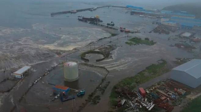 ▲ 30일 캄차카반도 강진으로 러시아 쿠릴 열도 파라무시르 섬의 세베로쿠릴스크 해안 지역을 강타한 쓰나미