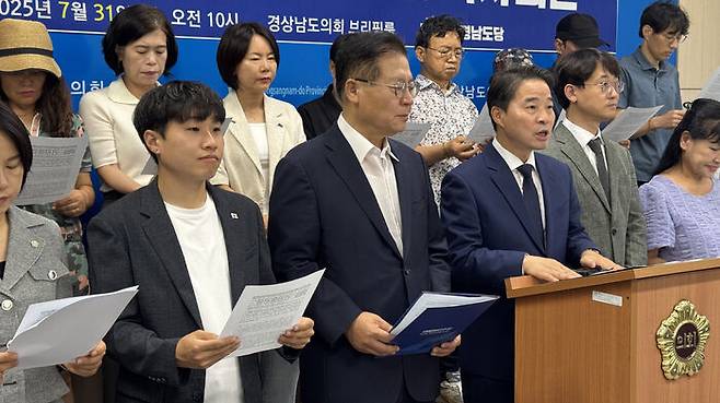 ▲ 민주당 경남도당과 법무법인 믿음이 31일 경남도의회에서 윤석열 전 대통령·김건희 여사 부부를 상대로 손해배상에 나서는 국민소송단 모집을 시작하는 기자회견을 하고 있다.