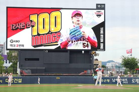 양현종은 5⅔이닝 80구 3피안타 4탈삼진 2사사구 1실점으로 시즌 6승 요건을 충족했다. 이날 등판 전까지 99⅔이닝을 소화했던 양현종은 아웃 카운트를 한 개 추가해 KBO리그 역대 두 번째 12시즌 연속 100이닝 소화에 성공했다.