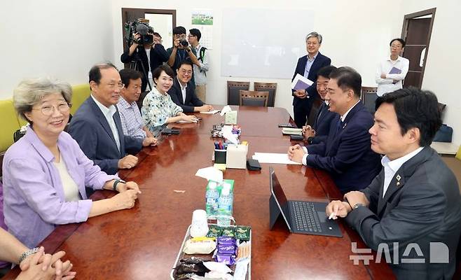 [서울=뉴시스] 조성봉 기자 = 김병기(오른쪽 두번째) 더불어민주당 당대표 직무대행 겸 원내대표가 31일 오전 서울 여의도 국회에서 한미간 통상안보 관련 장영달(왼쪽 두번째), 최순영 등 전국비상시국회의 상임대표단과 면담을 하고 있다. 2025.07.31. suncho21@newsis.com