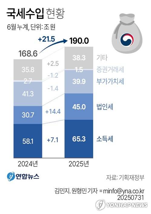 (서울=연합뉴스) 원형민 기자 = 기획재정부가 31일 발표한 '6월 국세수입 현황'에 따르면 올해 1월부터 6월까지 누적 국세 수입은 190조원으로 집계됐다.