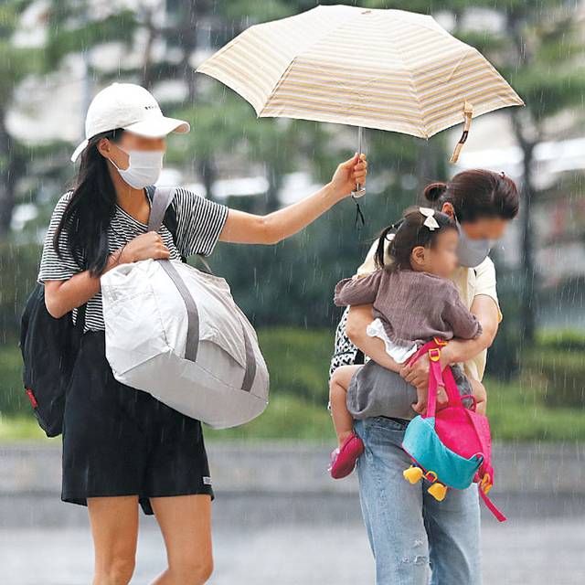 갑작스러운 소나기에 미처 우산을 준비하지 못했던 한 어머니가 아이를 안고 발걸음을 재촉했다.