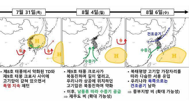 현재, 한반도를 뒤덮고 있는 이중 고기압은 서쪽의 열대저압부와 일본 동부를 지나는 9호 태풍 크로사 사이에 고립된 상태로, 주 후반까지 맑고 뜨거운 날씨가 유지될 전망입니다.