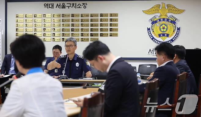 (의왕=뉴스1) 국회사진기자단 = 김현우 서울구치소장이 31일 경기 의왕시 서울구치소를 방문한 더불어민주당 3대특검(내란·김건희·순직해병) 종합대응 특별위원회 위원들과 면담하고 있다. 2025.7.31/뉴스1
