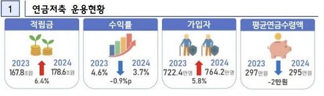 금융감독원이 31일 발표한 '2024년 연금저축 운용현황'에 따르면 2024년 말 기준 연금저축 총 적립금은 178조6000억원으로 전년 167조8000억원 대비 10조8000억원(6.4%) 증가했다.