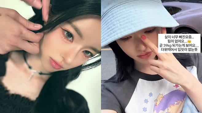 해당 게시물에는 유혜원이 모자를 깊게 눌러쓴 채 고개를 숙이고 있는 모습이 담겼다. 이어 그는 "곧 39kg 돼 가는 게 보인다. 더위 먹어서 입맛이 없는 듯하다"며 극심한 체중 감소로 인한 피로감을 호소했다.