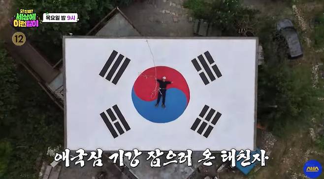그는 "아마 우리나라에서 개인이 소장한 태극기 중에서는 제일 클 것"이라며 "제가 소유한 곳 중 제일 넓은 집 지붕에 태극기를 그렸다"라고 말해 모두를 놀라게 한다.