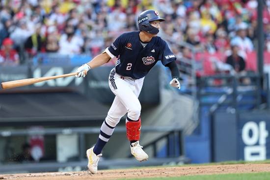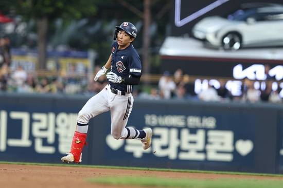 4회초 2사 뒤 두 번째 타석에 들어선 김민석은 상대 선발 투수 김도현의 2구째 146km/h 속구를 노려 중앙 담장을 직격하는 큼지막한 3루타를 때렸다. 이후 정수빈의 1타점 적시 3루타 때 홈을 밟았다.