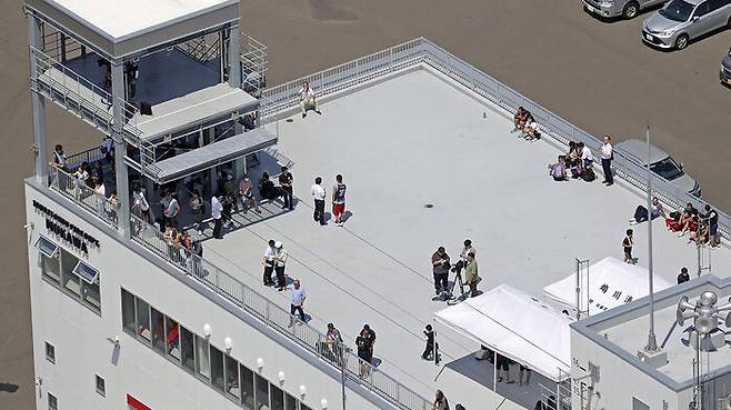 ▲ 지진으로 일본 일부 지역에 쓰나미 경보가 발령된 후 일본 북부 홋카이도 무카와 마을의 소방서 옥상에서 사람들이 대피하고 있다.