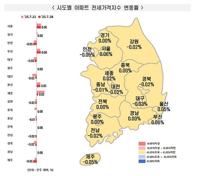 5대 광역시는 0.04%, 8개 도는 0.02% 하락했고 세종시는 0.04% 상승했습니다.