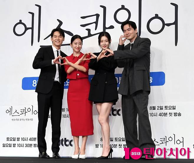 배우 이진욱, 정채연, 이학주, 전혜빈이 31일 서울 구로구 신도림 더 링크 호텔에서 열린 JTBC 새 토일드라마 <에스콰이어> 제작발표회에 참석해 포즈를 취하고 있다. 에스콰이어>