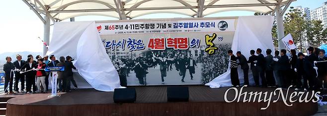 | ▲ 11일 오전 창원마산 김주열열사시신인양지에서 열린 ”제65주년 4?11민주항쟁 기념, 김주열 열사 추모식“. 추모의벽 제막식. |