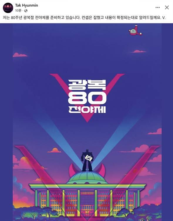 광복절 전야제 연출을 맡은 문재인 정부 청와대 의전비서관 출신 탁현민 국회의장 행사기획자문관은 이달 28일 오후 자신의 사회관계망서비스(SNS)에 한 장의 이미지를 올려 "80주년 광복절 전야제를 준비하고 있다, 콘셉트는 잡혔고 내용이 확정되는 대로 알려드리겠다"고 밝혔다.