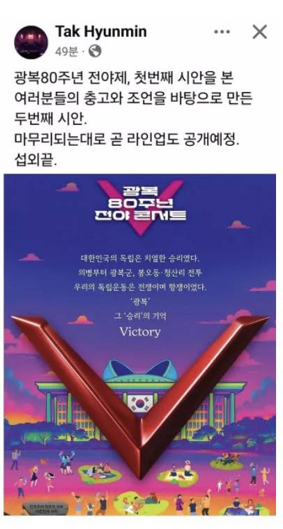 탁현민 자문관이 올린 이미지 중앙에는 '광복 80 전야제'라는 문구가 적혀 있고, 그 아래 국회의사당 돔 위에 로봇 실루엣과 태극기가 그려져 있다. 이어 국회의사당 건물 양쪽으로 붉은 'V자' 형상이 크게 겹쳐져 있다. 로봇 실루엣 뒤에도 V자가, 문구 뒤에도 V자가 있는데 이는 전야제 때 국회의사당을 비출 조명을 뜻하는 것으로 보여진다.