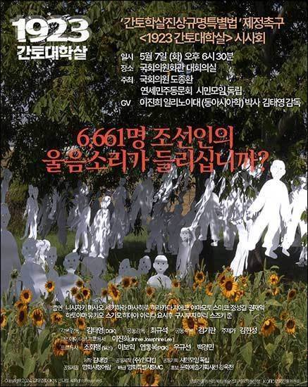 | ▲ 간토대학살 영화 시사회 홍보물 1923년 간토대학살 영화 시사회(국회의원회관 대회의실, 2024년 5월 7일)와 진상규명특별법 제정을 촉구하는 홍보물 |