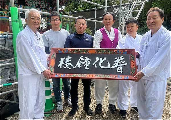| ▲ 단청장인 등과 보화종루 현판 양영송 단청장인, 일본 사람 두 분, 기항권, 김영석 선생, 양용선 단청장인(왼쪽부터) 들이 '보화종루' 현판을 들고 있다. |