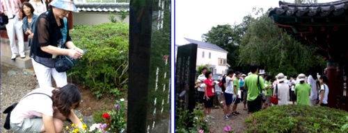 | ▲ 보화종루 앞에서 추모 모임 “경술국치 100년, 한일평화를 여는 역사기행” 답사단들이 관음사 경내 보화종루 앞에서 추모 모임을 갖고 있는 모습(2010년 8월 15일) |