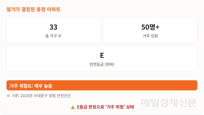 이에 서대문구는 올해부터 충정 아파트 주민의 이주를 지원한다. 연내 SH(서울주택도시개발공사) 임대주택 또는 임시 거처 제공이 추진될 예정이다. 아파트 철거는 빠르면 사업시행인가가 내려질 2026년쯤 이뤄질 전망이다.