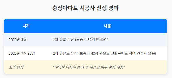 해당 사업은 충정 아파트를 포함한 인근 저층 주택 일대를 지하 6층~지상 28층, 192가구 규모의 주상복합 시설로 탈바꿈하는 사업이다. 총 사업비는 1차 입찰과 동일한 약 1314억 원이다.