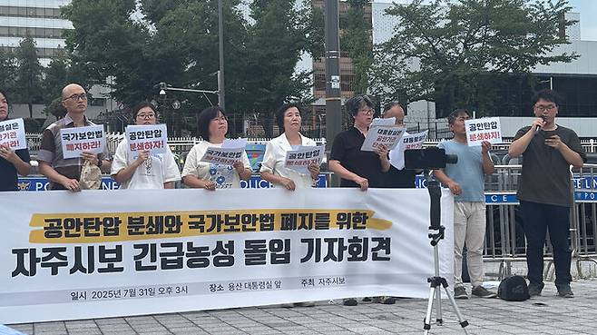 김 모 자주시보 기자는 "이재명 정부의 남북관계 개선 움직임을 막으려는 의도의 공안 탄압이 기승을 부리고 있다"며 "대통령실이 나서서 공안기관을 단속하고 국보법을 폐지해야 한다"고 주장했습니다.