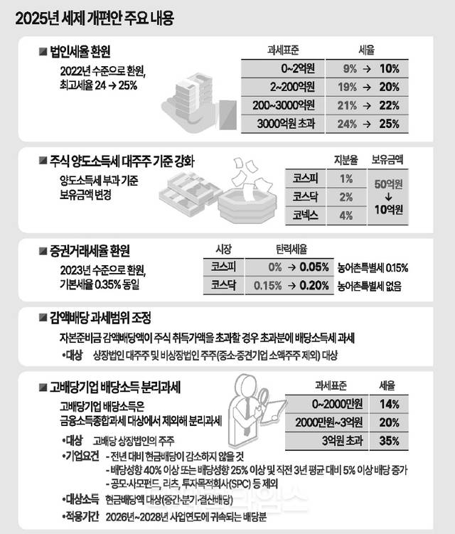 이 정부의 첫 세제 개편안에는 법인세 최고세율 인상과 함께 증권거래세율 인상, 대주주 양도소득세 기준 강화 등 ‘증세’ 기조가 고스란히 반영됐다. 부족한 세입 기반을 늘리고, 세 부담을 정상화하기 위함이란 게 정부 설명이다.