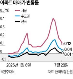 서울 아파트값 상승률은 6월 넷째주 0.43%까지 치솟으나 같은달 28일 대출 규제가 전격 시행되면서 5주째 둔화하고 있다. 부동산원 관계자는 “서울 전역에 관망세가 확산하며 거래 위축과 함께 상승폭이 축소됐다”고 설명했다.
