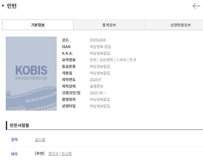 지난 17일 최종 수정된 영화진흥위원회의 데이터베이스에 따르면 영화 '인턴'의 주연으로 최민식과 한소희가 낙점됐다.