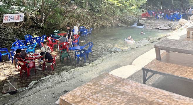 계곡 안으로 들어서자 플라스틱 평상과 테이블, 의자가 빼곡히 놓여 있었고, 천막까지 덮여 햇볕을 피할 수 있는 그늘까지 제공됐다. 인근에는 '하천무단 점유(평상·천막), 옥외영업 등 금지, 위반 시 관련 법에 따라 처분 또는 고발될 수 있습니다'라는 현수막이 붙어 있었지만, 무색하게 만든 순간이었다.