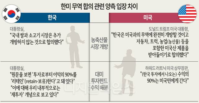 무엇보다도 한국이 ‘레드라인’으로 설정한 농축산물 추가 개방과 대미 투자에 따른 수익을 누가 갖느냐의 문제에서 한미의 주장과 해석이 다르다는 게 가장 큰 문제다.