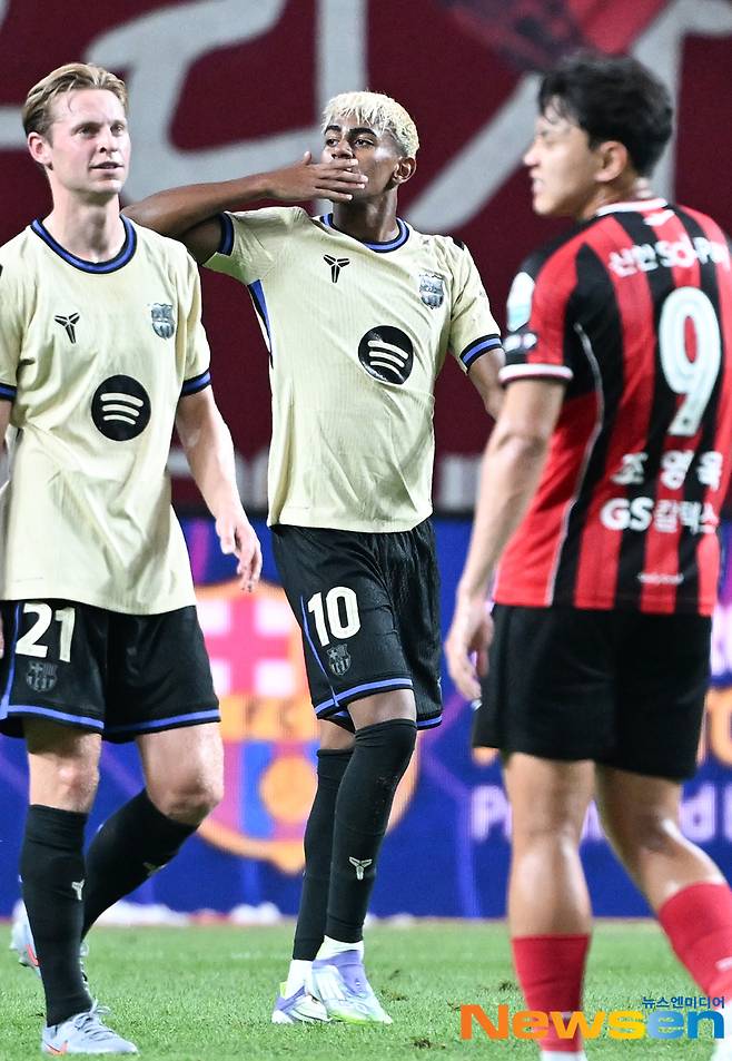 이날 전반전 FC 바르셀로나 라인 야말이 골을 넣고 손키스를 보내고 있다.