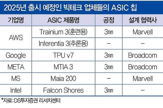 AI 칩 주요 작업이 ‘추론’과 ‘연산’ 등으로 세분화해 ASIC 수요가 급증할 것으로 IT 업계는 예상한다. 시장에서는 내년 ASIC 출하량이 엔비디아 AI 칩 공급량을 넘어설 수 있단 장밋빛 전망이 나온다. JP모건은 올해 글로벌 ASIC 시장 규모가 약 300억달러(약 41조원)에 달하고, 연평균 30% 이상 성장하리라 봤다.