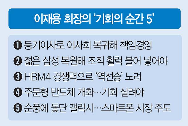 사법 리스크를 떨궈낸 지금, 이 회장이 ‘기회의 순간’을 찾아야 한다는 목소리가 높다. 이사회 복귀를 통한 책임경영과 적극적인 인수합병(M&A), 대대적인 인사를 통한 조직 혁신, HBM과 주문형반도체 기술력 향상, 스마트폰 주도권 회복 등이 퀀텀점프 계기로 꼽힌다.