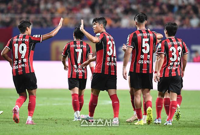 FC서울 정한민(가운데)이 31일 서울월드컵경기장에서 열린 FC바르셀로나와의 친선 경기에서 추격골을 넣고 동료들과 하이파이브를 하고 있다. 2025. 7. 31.