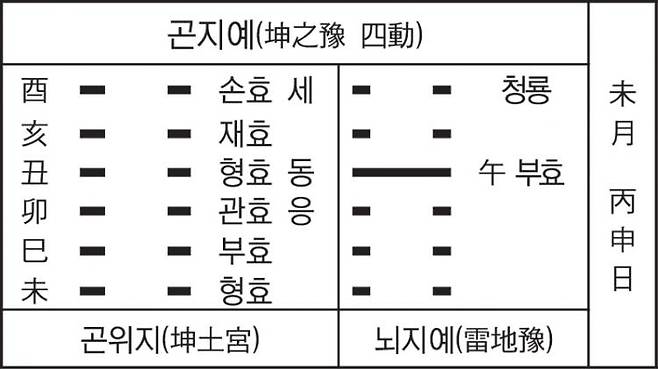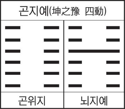 곤괘의 ‘실점예’로서 ‘실종된 자손을 찾을 수 있는 여하’를 문점하자, 곤위지 육사가 동해 ‘곤지예’(坤之豫)를 득괘하고 다음과 같이 점고했다. ‘변괘 뇌지예(雷地豫)괘는 진뢰 장자(상괘)가 곤모의 어머니의 배 속에서 솟아 나와 곤모의 어미를 만나는 모자 상봉의 상이다. 이 자손은 서북쪽 하천에 숨어 있다가 내일 묘시나 진시에 나타나 찾게 된다’고 판단했다. 그 까닭은 서북쪽 하천의 장소는 숨어있는 은복(隱伏)괘에서는 음양이 반대되는 상을 취하는데, 은복괘는 곤토(坤土)의 건금(乾金)에 해당하고 건천은 서북쪽이고 큰 하천이며 묘진시는 상괘 변괘 진뢰가 묘진시(卯辰時)를 의미하기 때문이다.