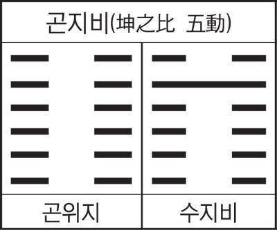 육오가 변하면 수지비(水地比)괘가 되니 비(比)는 ‘친할 비’로 자신의 의견을 내세워 주장하기 보다는 남의 의견을 잘 받아들이고 주변 사람들과 화합하고 친하게 지내는 것이 길하다.