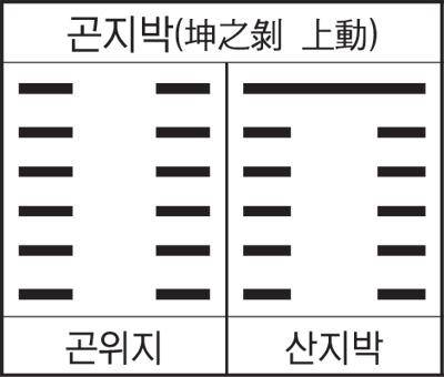 상육이 변하면 산지박(山地剝)괘가 되니 소망, 사업, 거래, 전업, 이사, 신축, 혼담 등 모든 일은 좋지 않다. 떨어져 다치거나 함정에 빠지고 분쟁이 일어난다. 가출인은 빈괘(賓卦)가 복괘(復卦)로 후회하고 돌아올 수 있으며 분실물은 찾기 힘들다. 병점에서는 무너지는 상이 있으며 여성의 경우는 유난히 생리가 심하다(剝卦).