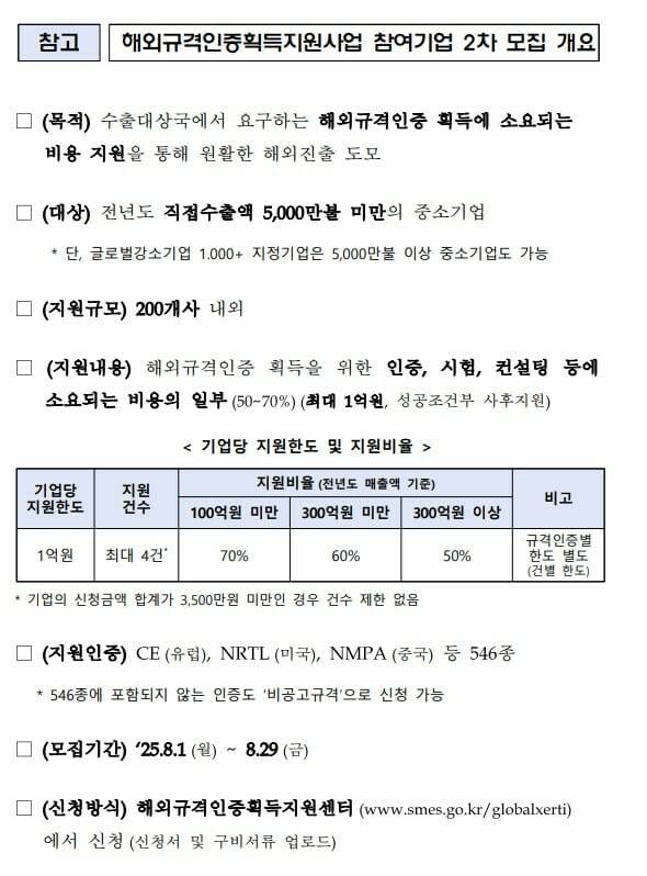 중소벤처기업부(중기부)는 오는 1일부터 2025년 해외규격인증획득 2차 지원사업에 참여할 중소기업을 모집한다고 밝혔다.