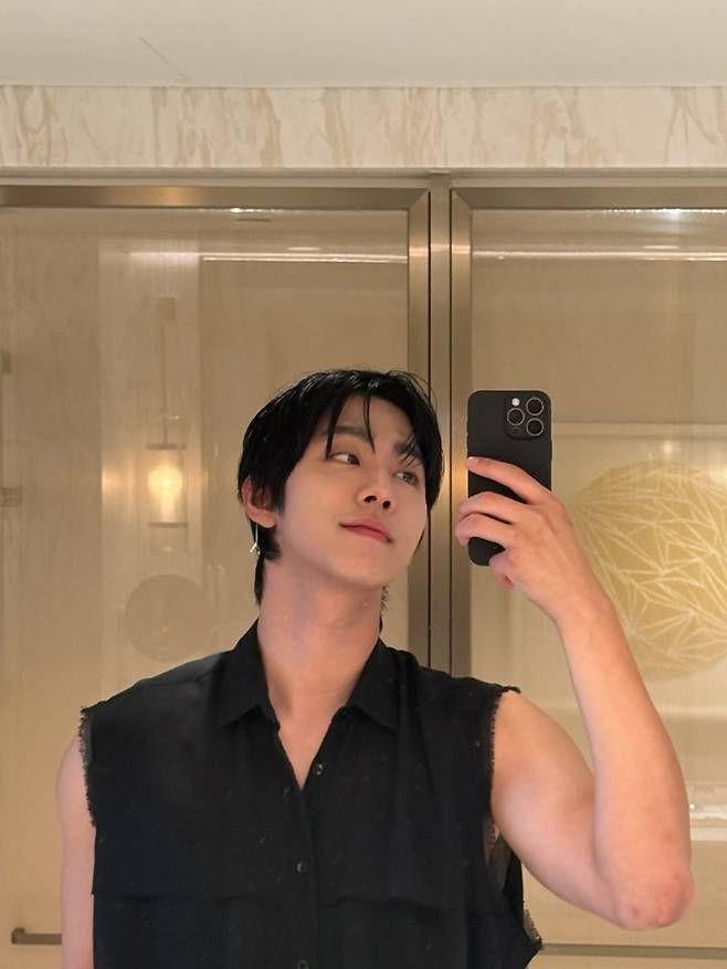 욕실 거울에서 촬영한 셀카로, 다소 캐주얼하면서도 무드 있는 느낌을 자아낸다. 셔츠의 거친 컷팅 디테일과 팔근육이 자연스럽게 드러나며, 시크함과 강렬함을 동시에 갖춘 모습이다.