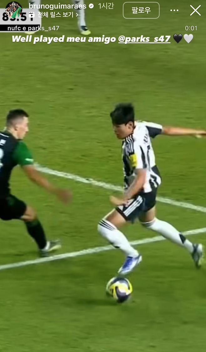 기마랑이스는 여기서 멈추지 않았다. 그는 SNS를 통해서도 박승수가 보인 활약에 박수를 건넸다. 박승수가 드리블하는 영상을 올린 기마랑이스는 “정말 잘했어. 내 친구 승수”라고 덧붙였다. 기마랑이스는 박승수와 마찬가지로 뉴캐슬 데뷔전을 치른 맥스 톰프슨(20)도 축하하며 주장으로서 역할을 이어갔다.
