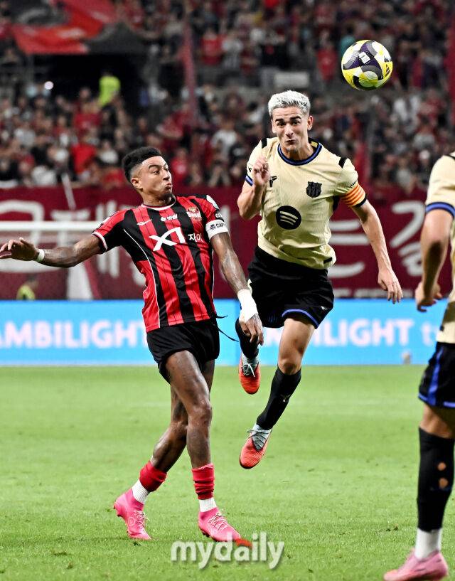 [마이데일리 = 송일섭 기자] FC서울 린가드와 FC바르셀로나 가비가 31일 오후 서울 상암동 서울월드컵경기장에서 진행된 'FC 바르셀로나 2025 아시아투어 에디션' FC바르셀로나와 FC서울의 경기에서 볼다툼을 벌이고 있다.